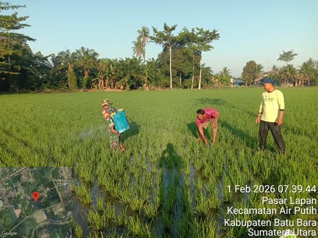 Pendampingan ini bertujuan untuk menekan serangan hama sejak dini sehingga pertumbuhan tanaman dapat berjalan optimal. Babinsa juga mendorong petani untuk terus menjaga kebersihan lahan dan melakukan perawatan tanaman secara berkala, dalam kesempatan ini seperti yang dilakukan oleh Personel Bintara Pembina Desa (Babinsa) Koramil 02/Air Putih jajaran Kodim 0208/Asahan Serma AL Samosir turun kewilayah binaan untuk melaksanakan kegiatan pendampingan Hanpangan, kegiatan Hanpangan membantu Petani melakukan penyemprotan hama padi, agar padi terhindar dari hama di lahan sawah milik Bapak Edi Seluas 6 Rante, kegiatan tersebut yang dilaksanakan bertempat di Desa Pasarlapan Kecamatan Air Putih Kabupaten Batu Bara, Minggu (01/02/2026).