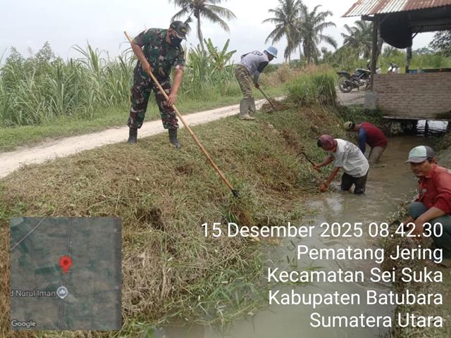 Batu Bara  |  Kegiatan gotong-royong ini melibatkan warga masyarakat setempat bersama Babinsa dengan tujuan untuk mewujudkan hidup sehat, selain itu juga untuk menumbuhkan kebersamaan diantara seluruh lapisan masyarakat, pada kesempatan tersebut seperti halnya yang dilakukan oleh Personel Bintara Pembina Desa (Babinsa) Koramil 02/Air Putih jajaran Kodim 0208/Asahan Sertu Fahmi turun kewilayah binaan untuk melaksanakan kegiatan Gotong Royong pembersihan saluran Irigasi, gotong royong membantu membersikan saluran irigasi parit bersama warga desa binaan dan poktani, kegiatan ngontong royong bersama masyarakat membersihkan saluran irigasi yang bertujuan untuk melancarkan air supaya lancar masuk ke sawah masyarakat, kegiatan Gotong Royong membersihkan Parit Irigasi  supaya air yang mengalir lancar ke persawahan masyarakat, bersama dengan Bapak Santo (Kadus), Bapak Legimin (Warga), Bapak Herman (warga) dan Bapak Bowo (Warga), kegiatan tersebut yang dilaksanakan bertempat di Dusun 6 Desa Pematang Jering Kecamatan Sei Suka Kabupaten Batu Bara, Senin (15/12/2025).