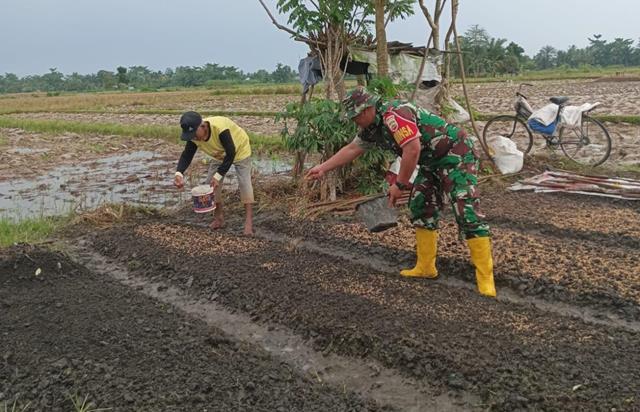 Batu Bara | Dalam rangka bercocok tanam padi, benih padi yang bagus dan unggul akan lebih tahan terhadap hama dan penyakit, selain itu pertumbuhannya juga bagus, waktu panen yang lebih singkat serta hasil panen yang optimal, dalam kesempatan ini Personel Bintara Pembina Desa (Babinsa) Koramil 02/Air Putih jajaran Kodim 0208/Asahan Serka Ady Sutrisno turun kewilayah binaan untuk melaksanakan kegiatan ketahanan Pangan membantu warga binaan dalam rangka untuk melaksanakan pembibitan padi untuk ditanam di sawah, dengan melaksanakan kegiatan ketahan Pangan membantu petani menabur bibit padi di lahan milik Bapak Samito, kegiatan tersebut yang dilaksanakan bertempat di Desa Pasar Lapan Kecamatan Air Putih Kabupaten Batu Bara, Minggu (25/01/2026).