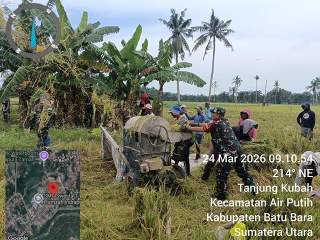 Batu Bara  |  Dalam rangka wujud dukungan TNI khususnya prajurit kewilayahan yaitu Babinsa dalam mendukung ketahanan pangan, dengan Semangat ikut serta terjun langsung ke sawah bantu para petani desa binaannya saat memanen padi, inilah yang dilakukan oleh Babinsa kepada para petani warga desa binaannya. Dengan penuh rasa semangat, dalam kesempatan ini seperti yang dilakukan oleh Personel Bintara Pembina Desa (Babinsa) Koramil 02/Air Putih jajaran Kodim 0208/Asahan Sertu Wardoyo turun kewilayah binaan untuk melaksanakan kegiatan Komsos dan sekaligus membantu Panen Padi, kegiatan pendampingan petani memanen padi menghasilkan yang baik dan bermutu Hanpangan, dengan membantu petani dalam kegiatan memanen padi dengan luas 8 rante milik Bapak R Sitorus, kegiatan ini dilaksanakan guna mewujudkan program pemerintah dalam bidang Swasembada pangan, kegiatan tersebut yang dilaksanakan bertempat di Desa Tanjung Kubah Kecamatan Air Putih Kabupaten Batu Bara, Selasa (24/03/2026).