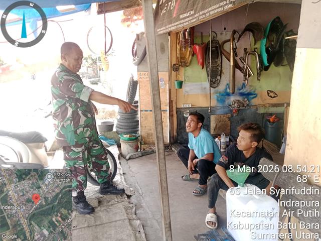 Batu Bara | Dalam rangka untuk membangun Komsos ini harus disemua golongan, dari muda hingga yang tua, tujuannya agar menciptakan lingkungan yang aman tentram dan nyaman, sehingga mudah terkendali jika terjadi sesuatu, dalam hal ini Personel Bintara Pembina Desa (Babinsa) Koramil 02/Air Putih jajaran Kodim 0208/Asahan Sertu Anwar Sadat turun kewilayah binaan untuk melaksanakan kegiatan Komunikasi Sosial (Komsos) bersama dengan warga masyarakat binaan, dengan melaksanakan Komunikasi Sosial di Bengkel sepeda motor, kegiatan Komsos bersama pemilik bengkel sepeda motor. Babinsa menyampaikan agar pemilik bengkel sepeda motor tidak menampung kendaraan hasil curian, kegiatan komsos dengan warga desa binaan serta pemilik usaha bengkel sepeda motor dan penambal ban untuk menjalin keakraban yang merupakan salah satu tugas Babinsa agar selalu dapat berkomunikasi dengan harmonis, bersama dengan Bapak Putra (Pemilik Bengkel) dan Bapak Andi (Pelanggan), kegiatan tersebut yang dilaksanakan bertempat di Bengkel Bapak Putra Jalan Sarifuddin Kelurahan Indrapura Kecamatan Air Putih Kabupaten Batu Bara, Minggu (08/03/2026).