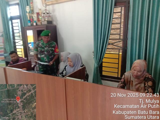 Untuk menindak lanjuti kegiatan tersebut dalam kesempatan ini kali ini seperti yang dilakukan oleh Personel Bintara Pembina Desa (Babinsa) Koramil 02/Air Putih jajaran Kodim 0208/Asahan Serma AL Samosir turun kewilayah binaan untuk melaksanakan kegiatan Full Data Ter sekaligus Komsos, kegiatan Puldata Ter bersama Perangkat Desa dalam rangka membahas tentang kamtibmas, pengumpulan data GEO, DEMO, KONSOS, kegiatan ini bertujuan untuk memperoleh data terbaru yang di perlukan Babinsa meliputi data Geografi, Demografi dan Kondisi Sosial masyarakat di wilayah binaan, data-data tersebut sangat di perlukan oleh satuan komando kewilayahan guna terlaksananya pembinaan teritorial sesuai dengan program dan fungsi komando kewilayahan, Pul Data Ter bidang Demografi tentang jumlah penduduk desa Tanjung mulia saat ini sebanyak 2374 jiwa, laki2 jumlah 1198 jiwa, perempuan jumlah 1176 jiwa, bersama dengan Ibu Sri Wulan Sari (Kasi Pemerintahan) dan Bapak Suheru (Kasi Kesejahteraan), kegiatan tersebut yang dilaksanakan bertempat di Desa Tanjung Mulia Kecamatan Air Putih Kabupaten Batu Bara, Kamis (20/11/2025).
