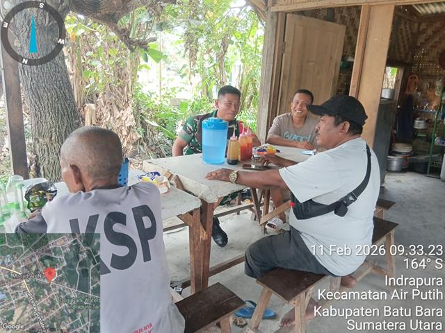 Batu Bara | Para Babinsa melaksanakan Komsos dalam rangka menjaga hubungan yang harmonis dengan masyarakat diwilayah binaan dengan melakukan kegiatan Komunikasi Sosial bersama warga Desa, Komsos ini dilakukan sebagai upaya mempererat tali silaturahmi serta meningkatkan kedekatan antara TNI dengan masyarakat di wilayah binaan, melalui kegiatan tersebut Babinsa dapat mengetahui perkembangan situasi wilayah sekaligus menyerap aspirasi dan kebutuhan warga, dalam kesempatan ini seperti yang dilakukan oleh Bintara Pembina Desa (Babinsa) Koramil 02/Air Putih jajaran Kodim 0208/Asahan Serda Hardianto turun kewilayah binaan untuk melaksanakan kegiatan Komunikasi Sosial (Komsos) bersama dengan warga masyarakat di Wilayah desa binaan, Komsos dengan masyarakat dilaksanakan untuk mempererat hubungan silaturahmi sehingga tercipta kemanunggalan TNI dengan rakyat, Komsos bersama masyarakat di Wilayah Binaan di warung Bapak Man, bersama dengan Bapak Parjo (Masyarakat) dan Saudara Rio (Pemuda), kegiatan tersebut yang dilaksanakan bertempat di Lingkungan 4 Kelurahan Indra Sakti Kecamatan Air Putih Kabupaten Batu Bara, Rabu (11/02/2026).