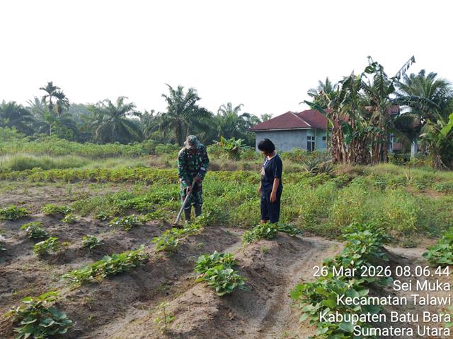 Batu Bara  |  Selain beras dan jagung, ubi rambat juga merupakan salah satu tanaman pokok bagi warga desa biaan, diharapkan dengan kegiatan seperti ini dapat memotivasi para warga, agar lebih giat lagi dalam bercocok tanam sehingga dapat memenuhi kebutuhan pangan setiap warga, dalam kesempatan ini seperti yang dilakukan oleh Personel Bintara Pembina Desa (Babinsa) Koramil 04/Talawi jajaran Kodim 0208/Asahan Pelda Sp Saragi turun kewilayah binaan untuk melaksanakan kegiatan Memonitor kegiatan Hanpang Ubi serta melaksanakan pendampingan Hanpangan di lahan singkong/ubi bersama-sama warga desa, kegiatan pendampingan petani dalam program Hanpangan dilahan Ibu T Manurung membantu petani perawatan tanaman dan pembersihan agar tumbuh maksimal, kegiatan tersebut yang dilaksanakan bertempat di Desa Sei Muka Kecamatan Datuk Tanah Datar Kabupaten Batu Bara, Kamis (26/03/2026).