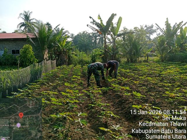 Batu Bara | Dalam rangka kegiatan pendampingan ini dilakukan guna menciptakan keakraban dengan petani, serta bertujuan untuk mengatasi ketahanan pangan dan juga memberikan motivasi kepada para petani agar lebih giat lagi dalam bekerja dan merawat lahan pertaniannya, singkong merupakan salah satu tanaman pangan sumber karbohidrat selain jagung dan padi, budidaya tanaman ubi kayu juga untuk mewujudkan ketahanan pangan dimasyarakat, dalam kesempatan ini seperti yang dilakukan oleh Personel Bintara Pembina Desa (Babinsa) Koramil 04/Talawi jajaran Kodim 0208/Asahan Pelda Sp Saragi turun kewilayah desa binaan untuk melaksanakan kegiatan membantu warga yang sedang bertani ubi dalam rangka mendukung Ketahanan Pangan sekaligus membantu Petani merawat dan membersihkan gulma tanaman Singkong, kegiatan yang dilaksanakan pendampingan kepada petani perawatan tanam dan pembersihan agar tumbuh maksimal, bersama dengan Bapak Rizal (Petani), kegiatan tersebut yang dilaksanakan berlokasi di Dusun 2 Desa Sei Muka Kecamatan Datuk Tanah Datar Kabupaten Batu Bara, Kamis (15/01/2026).