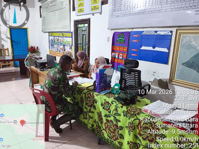 Batu Bara  |  Dalam rangka untuk memelihara dan menjalin hubungan baik dengan Siswa dan Siswi serta untuk meningkatkan Sinergitas dan kemanunggalan antara TNI dan masyarakat, kegiatan tersebut guna meng update data Keluarga Penerima Manfaat (KPM) atau yang berhak menerima Bantuan, sehingga bantuan yang diberikan oleh pemerintah dapat tersalurkan sesuai dan tepat sasaran, dalam hal ini seperti yang dilakukan oleh Personel Bintara Pembina Desa (Babinsa) Koramil 04/Talawi jajaran Kodim 0208/Asahan Sertu Dhani Maramis turun kewilayah binaan untuk melaksanakan kegiatan pendataan kepada warga masyarakat, dengan melaksanakan pemantauan pendataan bantuan masyarakat, dengan melaksanakan pendataan bantuan untuk masyarakat dilakukan bersama dengan Ibu Sopi (Operator) dan Ibu Irma KasiPem (Kaur Kesra), kegiatan tersebut yang dilaksanakan bertempat di Kantor Desa Mesjid Lama Kecamatan Talawi Kabupaten Batu Bara, Selasa (10/03/2026).