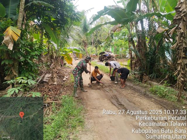 Batu Bara  |  Dalam rangka untuk meningkatkan infrastruktur yang ada di Desa binaan, untuk menjalin silaturahmi dan kerja sama yang baik antara masyarakat dan TNI serta untuk meciptakan Kemanunggalan TNI dengan Rakyat, sebagai ujung Tombak Kewilayahan Babinsa dengan bersama warga masyarakat melaksanakan kegiatan kerja bakti gotong royong memperbaiki jalan serta menutup lubang-lubang di jalan umum menggunakan tanah dan batu, dalam hal ini seperti yang dilakukan oleh Personel Bintara Pembina Desa (Babinsa) Koramil 04/Talawi jajaran Kodim 0208/Asahan Serma SP Saragih, Sertu Surianto, Serda Sidik P dan Koptu Sambari turun kewilayah binaan untuk melaksanakan kegiatan Gotong-royong perbaikan jalan yang berlubang, gotong royong memperbaiki jalan dan membersihkan paret, agar masyarakat mudah melalui jalan menggunakan kendaraan dan bersih lingkungan, bergotong royong menimbun jalan yang berlubang serta membersihkan selokan, bersama dengan Bapak Adi Gunawan (Kades Perk Petatal), Perangkat Desa Perkebunan Petatal dan warga Masyarakat Dusun VII Perk Petatal, kegiatan tersebut yang dilaksanakan bertempat di Dusun VII Desa Perk Petatal Kecamatan Datuk Tanah Datar Kabupaten Batu Bara, Rabu (27/08/2025).