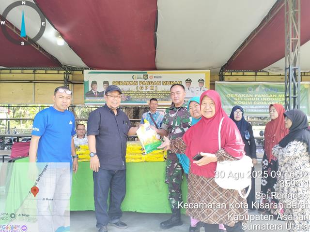 Asahan | Dalam rangka memeriahkan Hari Ulang Tahun (HUT) ke-80 Republik Indonesia, dalam kesempatan ini seperti yang dilakukan oleh 3 orang Personel Bintara Pembina Desa (Babinsa) Koramil 06/Kisaran jajaran Kodim 0208/Asahan Dpp Serma Sudarianto turut serta melaksanakan kegiatan Gerakan Pangan Murah (GPM) dalam rangka HUT Republik Indonesia Ke-80 secara serentak di Kecamatan Seluruh Indonesia, kegiatan Gerakan Pangan Murah (GPM) dibuka oleh Camat Kisaran Barat, dilanjutkan kegiatan pasar murah penjualan Beras Sphp dan minyak goreng merek minyak Kita, kegiatan tersebut yang dilaksanakan bertempat di Lapangan Pondok Kelurahan Sei Renggas Kecamatan Kisaran Barat Kabupaten Asahan, Sabtu (30/08/2025).