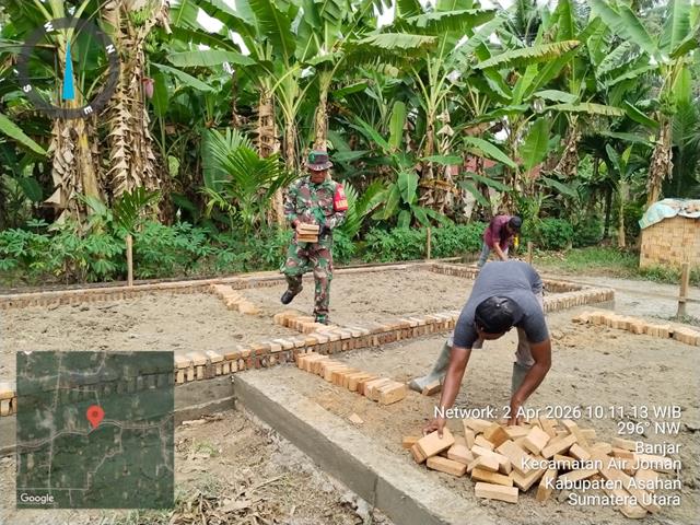 Asahan  |  Dalam rangka untuk memelihara dan menjalin hubungan baik Antara Babinsa dengn masyarakat, untuk meningkatkan rasa kepedulian terhadap masyarakat pada umumnya, guna meningkatkan kesejahteraan dan membangun keharmonisan dengan warga binaan, dalam kesempatan yang baik ini seperti halnya yang dilakukan oleh Personel Bintara Pembina Desa (Babinsa) Koramil 07/Air Joman jajaran Kodim 0208/Asahan Sertu Dahrum turun kewilayah binaan untuk melaksanakan kegiatan membantu pembangunan rumah warga desa yang kurang mampu, ini merupakan salah satu bentuk untuk menjalin kedekatan dan kebersamaan TNI dengan warga, dengan melaksanakan kegiatan Bakti TNI yaitu gotong royong, kegiatan Babinsa dalam hal ini melaksanakan kegiatan gotong royong membantu masyarakat membangun rumah di wilayah binaannya di Dusun 3 Desa Banjar, kegiatan ini rutinitas dilakukan untuk memelihara kekompakan, melalui kegiatan ini merupakan bentuk kepedulian babinsa KPD warga binaan, bersama dengan Bapak Anto (tukang) dan Bapak Riki (tukang), kegiatan tersebut yang dilaksanakan bertempat di Dusun 3 Desa Banjar Kecamatan Air Joman Kabupaten Asahan, Kamis (02/04/2026).