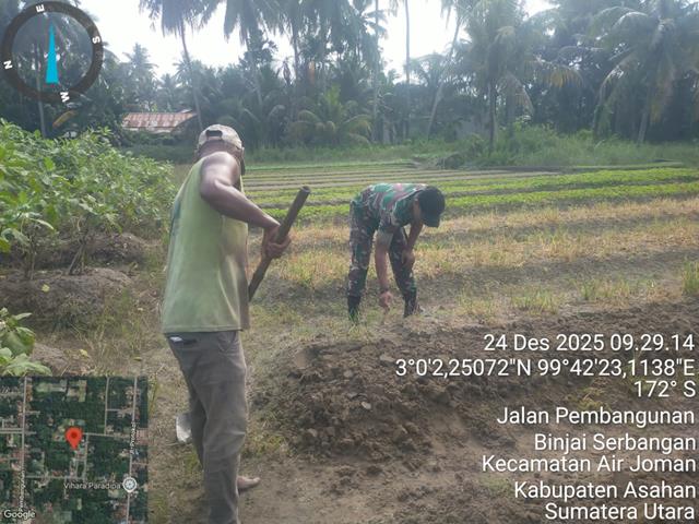 Dalam kesempatan ini seperti yang dilakukan oleh Personel Bintara Pembina Desa (Babinsa) Koramil 07/Air Joman jajaran Kodim 0208/Asahan Kopda Hambi Jaya turun kewilayah binaan untuk melaksanakan kegiatan Komunikasi Sosial (Komsos) sekaligus membantu petani melaksanakan kegiatan membantu petani jagung untuk menyiapkan lahan untuk penanama jagung agar hasil tanamnya lebih baik sesuwai keinganan para petani jagung, dengan melaksanakan Giat Puanter dilahan milik Bapak Sumardi, kegiatan Babinsa kali ini memantau sekaligus mendata pekarangan rumah yang akan di jadikan lahan tanaman sayur mayur, di tanami berbagai jenis sayuran, seperti kangkung, daun kemangi, dan sawi, giat Babinsa tersebut sudah menjadi tugas pokok sebagai seorang Babinsa sekaligus menjalin tali silaturrahmi antara Babinsa dengan warga desa binaan, kegiatan tersebut yang dilaksanakan bertempat di Lingkungan VI Kelurahan Binjai Serbangan Kecamatan Air Joman Kabupaten Asahan, Rabu (24/12/2025).