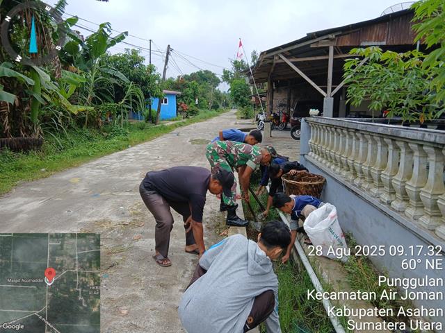 Asahan | Dalam rangka agar terjalinnya tali silaturahmi antara Babinsa dengan warga masyarakat Desa binaan, dalam hal ini seperti yang dilakukan oleh Personel Bintara Pembina Desa (Babinsa) Koramil 07/Air Joman jajaran Kodim 0208/Asahan Serda Hadi Ismanto turun kewilayah binaan untuk mlaksanakan kegiatan Gotong royong bersa masyarakat untuk menjalin kebersamaan yang Baik, kegiatan Gotong-royong bersama warga Bapak Iwan, Bapak Yudi, Bapak Hendri, Bapak Bagas dan Bapak Agus, kegiatan tersebut yang dilaksanakan bertempat di Jalan Pasar Melintang Dusun 1 Desa Punggulan Kecamatan Air Joman Kabupaten Asahan, Kamis (28/08/2025).