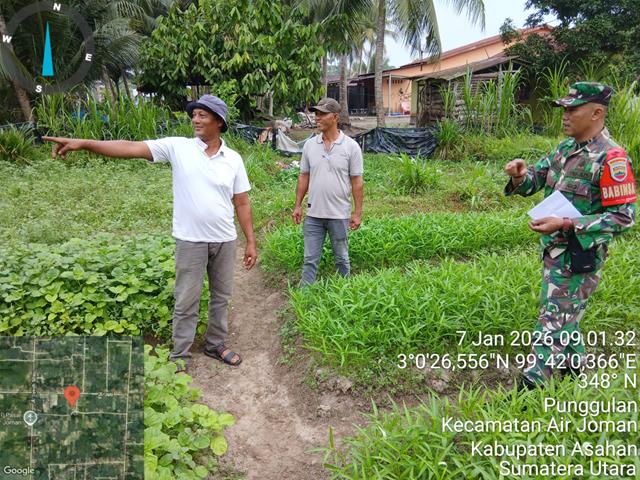 Kegiatan pengecekan lahan Petani menyambut baik kehadiran Babinsa yang aktif mendukung kegiatan pertanian di wilayah binaan, Dalam kesempatan ini seperti yang dilakukan oleh Personel Bintara Pembina Desa (Babinsa) Koramil 07/Air Joman jajaran Kodim 0208/Asahan Serda Hadi Ismanto turun kewilayah binaan untuk turut serta melaksanakan kegiatan Puanter di lahan Milik Bapak Suharjo, kegiatan Babinsa kali ini memantau sekaligus mendata lahan yang akan di jadikan lahan tanaman sayur mayur, seluas 5 rante untuk di tanami berbagai jenis sayuran, seperti Bayam, daun kangkung,dan sawi, bersama dengan Bapak Suharjo (pemilik lahan) dan Bapak Tukino (Masyarakar), kegiatan tersebut yang dilaksanakan bertempat di Dusun 3 Desa Punggulan Kecamatan Air Joman Kabupaten Asahan, Rabu (07/01/2026).