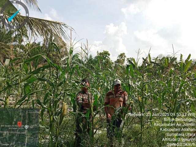 Asahan  |  Peran Babinsa di lapangan sebagai motivator agar para petani terus bersemangat dalam merawat tanamannya.Dari mulai tanam sampai panen selalu mendapat perhatian dikarenakan apabila terjadi kendala atau hama yang menyerang maka sedini mungkin bisa di atasi sehingga pertumbuhan tanaman jagung ini tidak terhambat yang berdampak pada hasil panen, dalam kesempatan ini seperti yang dilakukan oleh Personel Bintara Pembina Desa (Babinsa) Koramil 07/Air Joman jajaran Kodim 0208/Asahan Serda Rinaldi Asmar Tanjung turun langsung dampingi Petani mengecek pertumbuhan tanaman Jagung, bersama masyarakat melaksanakan pendampingan ketahanan pangan (Hanpang) jenis tanaman jagung hibrida Babinsa hadir untuk membantu pembersihan Jagung jenis hibrida, dengan melaksanakan Wanwil yaitu pendampingan kepada petani jagung, bersama dengan Bapak Timin (Pemilik Kebun), kegiatan tersebut yang dilaksanakan berlokasi di Desa Pasar Lembu Kecamatan Air Joman Kabupaten Asahan, Jumat (23/01/2026).