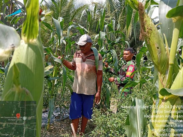 Tanaman Jagung saat ini sudah terbebas dari hama dan penyakit, hal ini karena selama masa pertumbuhan rutin melakukan penyiangan gulma, memupuk tanaman secara berimbang dan penyemprotan menggunakan herbisida dan fungisida yang sudah dikonsultasikan dengan PPL, kegiatan ini merupakan suatu bentuk dukungan dalam mensejahterakan masyarakat, sekaligus membantu pemerintah mensukseskan program swasembada pangan nasional, kehadiran saya dalam memberikan pendampingan adalah upaya untuk mensejahterakan masyarakat, sekaligus memberikan motivasi dan semangat kepada para petani, dalam kesempatan ini seperti yang dilakukan oleh Personel Bintara Pembina Desa (Babinsa) Koramil 07/Air Joman jajaran Kodim 0208/Asahan Serda Rinaldi Asmar Tanjung turun kewilayah desa binaan untuk melaksanakan kegiatan pendampingan petani Jagung, maksud dan tujuan membantu petani untuk membersihkan hama rumput liar, dengan melaksanakan kegiatan Puanter dilahan milik Bapak Idris, kegiatan tersebut yang dilaksanakan bertempat di Binjai Serbangan Kecamatan Air Joman Kabupaten Asahan, Kamis (16/04/2026).
