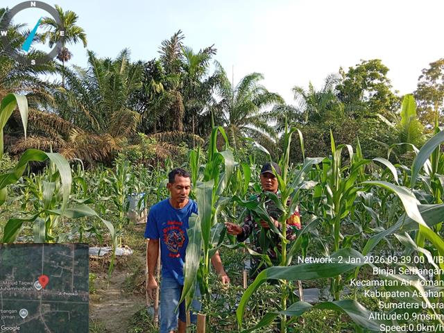 Asahan  |  Peran Babinsa di lapangan sebagai motivator agar para petani terus bersemangat dalam merawat tanamannya.Dari mulai tanam sampai panen selalu mendapat perhatian dikarenakan apabila terjadi kendala atau hama yang menyerang maka sedini mungkin bisa di atasi sehingga pertumbuhan tanaman jagung ini tidak terhambat yang berdampak pada hasil panen, dalam kesempatan ini seperti yang dilakukan oleh Personel Bintara Pembina Desa (Babinsa) Koramil 07/Air Joman jajaran Kodim 0208/Asahan Serda Rinaldi Asmar Tanjung turun langsung dampingi Petani mengecek pertumbuhan tanaman Jagung, bersama masyarakat melaksanakan pendampingan ketahanan pangan (Hanpang) jenis tanaman jagung hibrida Babinsa hadir untuk membantu pembersihan Jagung jenis hibrida, dengan melaksanakan kegiatan Wanwil yaitu membantu petani merawat tanaman jagung Bapak Joko Supriyono, kegiatan tersebut yang dilaksanakan berlokasi di Binjai Serbangan Kecamatan Air Joman Kabupaten Asahan, Jumat (02/01/2026).