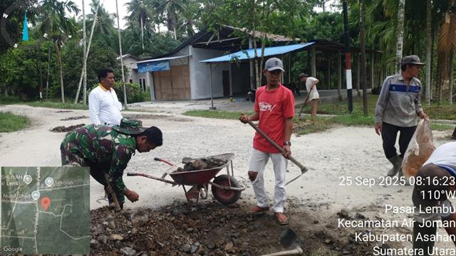 Kegiatan ini bertujuan untuk meningkatkan kebersihan dan kenyamanan lingkungan di desa serta memupuk semangat gotong-royong dan kemanunggalan TNI dengan masyarakat dengan sasaran kegiatan pembersihan rumput sekitaran Parit Selokan, bahu jalan, penimbunan tanah berlubang sepanjang 50 m dengan menggunakan batu petrun, serta pengangkutan sampah, kegiatan kerja bhakti ini juga diharapkan dapat menjadi contoh dan memotivasi masyarakat untuk lebih peduli dan aktif menjaga kebersihan lingkungan secara mandiri di wilayah dusunnya masing-masing, dalam kesempatan tersebut seperti yang dilakukan oleh Personel Bintara Pembina Desa (Babinsa) Koramil 07/Air Joman jajaran Kodim 0208/Asahan Pelda Yan Evan N turun kewilayah binaan untuk melaksanakan kegiatan Gotong-royong bersama warga dan perangkat desa, bersama dengan Bapak Usman Matondang (Kaur Desa Psr Lembu), Bapak Muklis Hsb (Kadus 1 Psr Lembu), Bapak Budiono (Kadus 2 Psr Lembu), Bapak Sofyan (Anggota LPM Dsn 1 Psr Lembu) dan Warga Dsn 1 Desa Pasar Lembu, kegiatan tersebut yang dilaksanakan bertempat di Dusun 1 Desa Pasar Lembu Kecamatan Air Joman Kabupaten Asahan, Kamis (25/09/2025).
