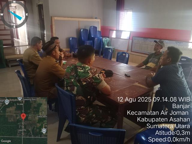 Asahan | Dalam rangka untuk menciptakan dan meningkatkan kerja sama yang baik serta menjalin hubungan antara TNI dan aparatur desa serta untuk menciptakan kemanunggal TNI dengan Rakyat, dalam kesempatan tersebut seperti hal yang dilakukan oleh Personel Bintara Pembina Desa (Babinsa) Koramil 07/Air Joman jajaran Kodim 0208/Asahan Serda Dahrum turun kewilayah binaan untuk melaksanakan kegiatan Komunikasi Sosial (Komsos) bersama dengan perangkat Desa untuk menjalin silaturahim antara Babinsa dan aparat Desa dan untuk mengetahui permasalahan yang ada diwilayah desa binaan, bersama dengan Bapak Feri (Sekdes Desa Banjar), Bapak Samsul (Kadus 5), Bapak Supriadi (Kadus 3), Bapak Anto dan Bapak Kariadi, kegiatan tersebut yang dilaksanakan bertempat di Balai Kantor Desa Banjar yang berada di Jalan Syech Silau Desa Banjar Kecamatan Air Joman Kabupaten Asahan, Selasa (12/08/2025).
