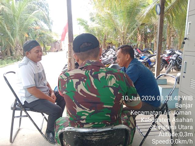 Asahan | Para Babinsa melaksanakan Komsos dalam rangka menjaga hubungan yang harmonis dengan masyarakat diwilayah binaan dengan melakukan kegiatan Komunikasi Sosial bersama warga Desa, Komsos ini dilakukan sebagai upaya mempererat tali silaturahmi serta meningkatkan kedekatan antara TNI dengan masyarakat di wilayah binaan, melalui kegiatan tersebut Babinsa dapat mengetahui perkembangan situasi wilayah sekaligus menyerap aspirasi dan kebutuhan warga, dalam kesempatan ini seperti yang dilakukan oleh Bintara Pembina Desa (Babinsa) Koramil 07/Air Joman jajaran Kodim 0208/Asahan Sertu Dahrum turun kewilayah binaan untuk melaksanakan kegiatan Komunikasi Sosial (Komsos) bersama dengan warga masyarakat di Wilayah desa binaan, Komsos membahas tentang situasi pasca menyambut Tahun Baru dimana situasi aman dan kondusif dan diharapkan di Tahun ini perekonomian masyarakat meningkat lebih baik dan tetap juga terjaga keamanan dan ketertiban, kegiatan ini dilaksanakan guna membangun kebersamaan sehingga TNI selalu dicintai Rakyat, dengan melaksanakan Komsos di Dapur MBG Banjar, bersama dengan Bapak Boy (Keamanan Dapur MBG) dan Bapak Epen (Relawan Dapur), kegiatan tersebut yang dilaksanakan bertempat di Dusun 2A Desa Banjar Kecamatan Air Joman Kabupaten Asahan, Sabtu (10/01/2026).