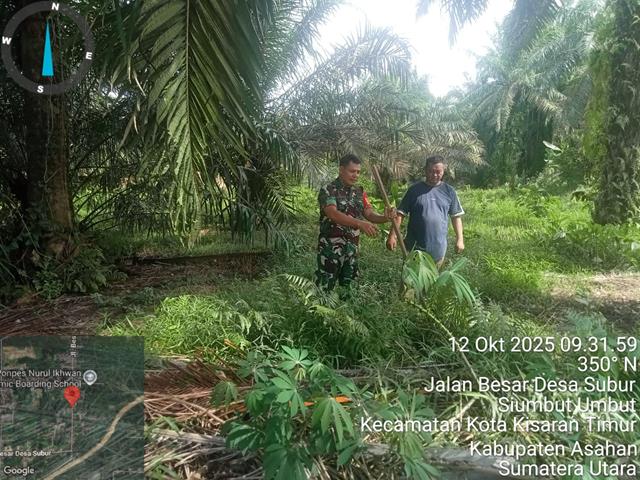 Dalam rangka untuk mendukung program pemerintah, kegiatan ini mendukung program swasembada pangan dan ketahanan pangan di wilayah binaan, dalam kesempatan ini seperti yang dilakukan oleh Personel Bintara Pembina Desa (Babinsa) Koramil 07/Air Joman jajaran Kodim 0208/Asahan Serda Erwinsyah turun kewilayah binaan untuk melaksanakan kegiatan pengecekan batas kebun sawit masyarakat untuk menjaga keamanan, mencegah sengketa, dan memastikan ketertiban di wilayah binaan. Kegiatan ini juga mencakup sosialisasi dan patroli untuk menjaga keamanan dan ketertiban, seperti pencegahan Karhutla atau pencurian, serta menjalin Komunikasi Sosial (Komsos) dengan petani serta memeriksa keberadaan plang batas atau penanda lainnya, memastikan tidak ada kerusakan, bersama dengan Bapak Syam Safitra, kegiatan tersebut yang dilaksanakan bertempat di Kebun Bapak Heri Dusun lll Desa Kecamatan Air Joman Kabupaten Asahan, Minggu (12/10/2025).