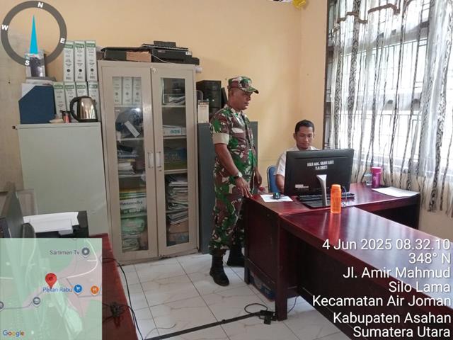 Asahan  |  Dalam rangka untuk memelihara dan membantu masyarakat Desa serta untuk menjalin Silahturrahmi yang erat bersama masyarakat, untuk meningkatkan sinergitas di wilayah binaanya, pada kesempatan ini seperti yang dilakukan oleh Personel Bintara Pembina Desa (Babinsa) Koramil 07/Air Joman jajaran Kodim 0208/Asahan Serda Jegronoto turun kewilayah binaan untuk melaksanakan kegiatan bersama pegawai kantor Camat melaksanakan Pul Data Ter pengecekan Geo Demo Konsos, dengan melaksanakan pengumpulan data GEO.DEMO.KONSOS dengan perangkat Kecamatan Silau Laut, bersama dengan Bapak Nurhadi (Staf Kecamatan), kegiatan tersebut yang dilaksanakan bertempat di Kantor kecamatan Kecamatan Silau Laut Kabupaten Asahan, Kamis (05/06/2025).