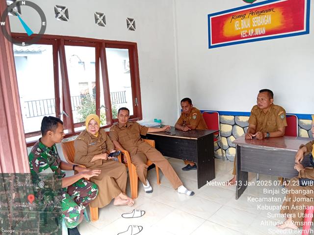 Asahan  |  Dengan aktif melaksanakan kegiatan ini diyakini mampu meningkatkan kerjasama dengan Perangkat Desa binaan guna menjaga keamanan dan ketentraman dimasyarakat, dalam rangka untuk mensukseskan tugas-tugas pemerintah yang ada diwilayah binaan serta meperbaharui data kewilayahan, dalam kesempatan ini seperti yang dilakukan oleh Personel Bintara Pembina Desa (Babinsa) Koramil 07/Air Joman jajaran Kodim 0208/Asahan Serda Rinaldi Asmar Tanjung turun kewilayah binaan untuk melaksanakan kegiatan Komunikasi Sosial (Komsos) sekalian  Puldata Ter, giat anjangsana bersama perangkat kelurahan dan warga masyarakat untuk kordinasi perencanaan giat gotong royong, kegiatan Komsos tersebut bersama dengan Ibu Tinur Simanjuntak (Lurah), Ibu Aswat (Staf Kelurahan), Bapak Kariyadi (Kepling 10), Bapak Dedi (Kepling 12) dan Bapak Usup (Kepling 3), kegiatan tersebut yang dilaksanakan bertempat di Kantor Kelurahan Binjai Serbangan Kecamatan Air Joman Kabupaten Asahan, Selasa (13/01/2026).
