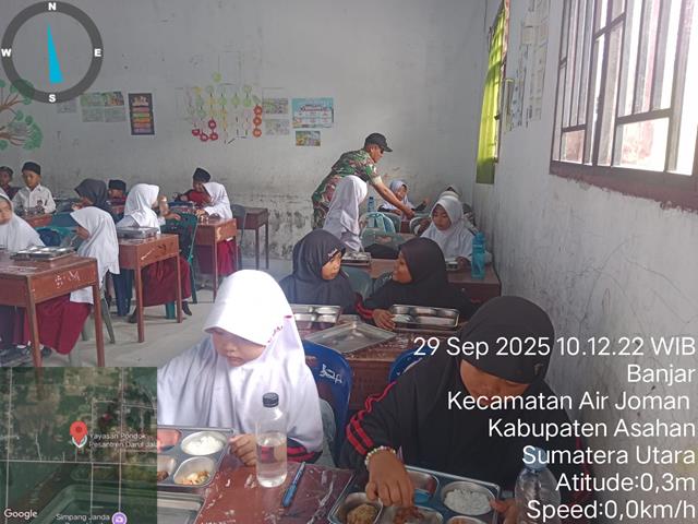Asahan  |  Materi Wawasan Kebangsaan ini sangat penting di Tanamkan sejak dini. Karena anak pada usia dini memiliki posisi strategis dalam membentuk dasar-dasar mental dan perilaku generasi muda bangsa, disamping itu untuk memberikan warna perjalanannya meraih cita-cita dimasa yang akan datang. Dalam kesempatan ini seperti yang dilakukan oleh Personel Bintara Pembina Desa (Babinsa) Koramil 07/Air Joman jajaran Kodim 0208/Asahan Serda Dahrum turun kewilayah binaan untuk melaksanakan kegiatan Binwanwil kepada Siswa/Siswi, Wawasan Kebangsaan tentang Makan Bergizi Gratis (MBG), kegiatan ini bertujuan mendampingi pembagian makan Bergizi Gratis agar benar benar sampai kepada siswa-siswi yg membutuhkan.kegiatan ini juga bertujuan mempererat hubungan TNI dgn masyarakat, bersama dengan Bapak Efendi (Kepala Sekolah) dan para Siswa siswi, kegiatan tersebut yang dilaksanakan bertempat di Ponpes Darul Jalal Dusun 1a Desa Banjar Kecamatan Air Joman Kabupaten Asahan, Senin (29/09/2025).
