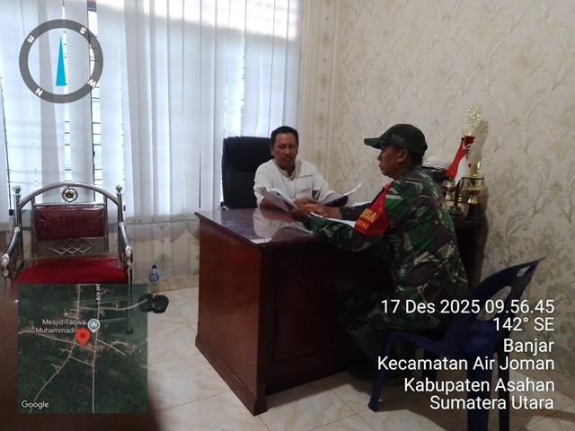 Asahan  |  Dalam rangka membicarakan tentang Pendataan Jumlah Penduduk yang baru pindah dan yang telah meninggal dunia untuk perbaharuan data, pada kesempatan tersebut Babinsa dapat mengetahui jumlah penduduk yang baru dan meninggal dunia di setiap Desa binaan, dalam kesempatan ini seperti yang dilakukan oleh Personel Bintara Pembina Desa (Babinsa) Koramil 07/Air Joman jajaran Kodim 0208/Asahan Kopka Rudi turun kewilayah binaan untuk melaksanakan kegiatan Pul Data Ter diwilayah di desa binaan, agar terjalin hubungan yang erat antara Babinsa dan perangkat desa, kegiatan Puldatater dengan perangkat Desa binaan yang bertujuan untuk mengetahui keadaan Desa binaan yang berkaitan dengan wilayah yang rawan bencana alam serta situasi dan kondisi Kamtibmas yang ada di desa binaan, Puldatater mendata Geo, Demo dan Konsos masyarakat, bersama dengan Bapak H Muliadi (Kades Lubuk Palas), kegiatan tersebut yang dilaksanakan bertempat di Kantor Desa Lubuk Palas Dusun 3 Desa Lubuk Palas Kecamatan Silau Laut Kabupaten Asahan, Rabu (17/12/2025).