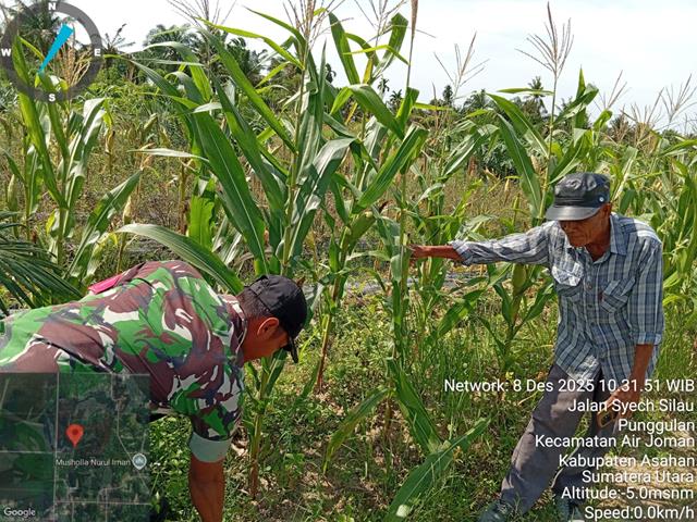 Dalam kesempatan ini seperti yang dilakukan oleh Personel Bintara Pembina Desa (Babinsa) Koramil 07/Air Joman jajaran Kodim 0208/Asahan Serda Rinaldi Asmar Tanjung turun kewilayah desa binaan untuk melaksanakan kegiatan pendampingan petani Jagung, maksud dan tujuan membantu petani untuk membersihkan hama rumput liar d tanaman jagung serta memberi motivasi kepada petani jagung agar lebih giat dalam perawatan untuk mendapatkan hasil panen yang maksimal, dengan melaksanakan Wanwil yaitu pendampingan kepada petani jagung, bersama dengan Bapak Sujarno (Pemilik Kebun), kegiatan tersebut yang dilaksanakan bertempat di Desa Pasar Lembu Kecamatan Air Joman Kabupaten Asahan, Senin (08/12/2025).