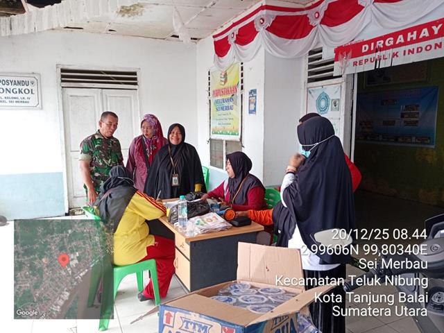 Dalam kesempatan ini para Danramil intruksikan kepada para Babinsanya agar tetap melaksanakan kegiatan Komunikasi Sosial secara humanis, caranya pun beragam salahsatunya bersilaturahmi dengan tenaga kesehatan dan dampingi masyarakat warga desa binaan yang sakit serta mengecek kesehatan ke tempat layan kesehatan baik Puskesmas, Klinik umum maupun ke Rumah sakit, dalam kesempatan ini seperti yang dilakukan oleh Personel Bintara Pembina Desa (Babinsa) Koramil 08/Pulau Buaya jajaran Kodim 0208/Asahan Sertu Agustiar turun kewilayah binaan untuk melaksanakan kegiatan Komunikasi Sosial (Komsos) lewat kegiatan puanter pendataan warga yang berobat di puskesmas, pengumpulan data Stanting bersama dengan perangkat Puskesmas, kegiatan puanter pendampingan pendataan kesehata bagi warga ibu ibu lansia dalam kegiatan menjaga kesehatan juga kebugaran bersama bidan dan tim kesehatan puskesmas teluk nibung kegiaran Babinsa saling bersilaturahmi bekerja sama dengan masyarakat dan puskesmas teluk nibung dalam rangka mendukung program kesegatan bagi ibu lansia di Kelurahan Sei Merbau, bersama dengan Ibu Hatari, Ibu Nuraisiah, Ibu Rani dan Ibu Dewi, kegiatan tersebut yang dilaksanakan bertempat di Jalan Kelong Lingkungan IV Kelurahan Sei Merbau Kecamatan Teluk Nibung Kota Tanjung Balai, Sabtu (20/12/2025).