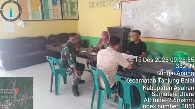 Asahan  |  Dalam rangka membicarakan tentang Pendataan Jumlah Penduduk yang baru pindah dan yang telah meninggal dunia untuk perbaharuan data, pada kesempatan tersebut Babinsa dapat mengetahui jumlah penduduk yang baru dan meninggal dunia di setiap Desa binaan, dalam kesempatan ini seperti yang dilakukan oleh Personel Bintara Pembina Desa (Babinsa) Koramil 08/Pulau Buaya jajaran Kodim 0208/Asahan Sertu Fauzi Nasution turun kewilayah binaan untuk melaksanakan kegiatan Pul Data Ter diwilayah di desa binaan, agar terjalin hubungan yang erat antara Babinsa dan perangkat desa, kegiatan Pengumpulan Data Teritorial (Puanter) bersama aparat pemerintah desa (Appem) dalam rangka pendataan jumlah penduduk, Kegiatan ini bertujuan untuk memperbarui data demografis masyarakat secara akurat sebagai dasar perencanaan pembangunan wilayah serta pendataan pada jumlah penduduk yang telah menerima imunisasi, sebagai bagian dari upaya monitoring dan evaluasi program kesehatan masyarakat, bersama dengan Bapak Indra, Bapak Aris dan Ibu Nurul, kegiatan tersebut yang dilaksanakan bertempat di Desa Sungai Apung Kecamatan Tanjung Balai Kabupaten Asahan, Selasa (16/12/2025).