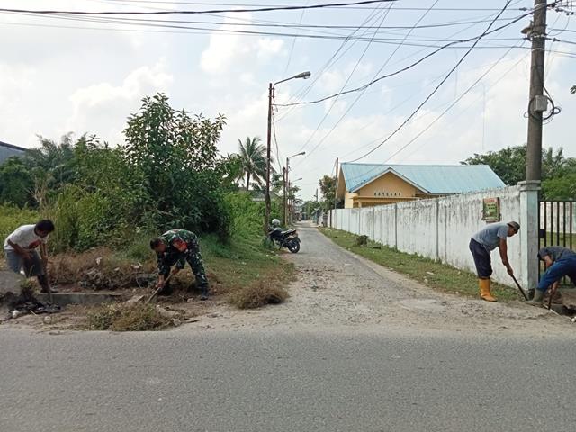 Gotong royong bersama masyarakat Pembersihan paritgot yang tersumbat Babinsa mengajak masyarakat yang di depan rumahnya terdapat sampah agar tidak membuang sampah kedalam parit demi kenyamanan bersama supaya parit bersih dan mengalir lancar, dengan melaksanakan kegiatan Bakti TNI dengan warga, kegiatan Bakti TNI bertujuan untuk bersilaturahmi dan membantu membersihkan tempat saluran air yang tersumbat oleh rumput karna sering datang hujan.kami dengan warga agar babinsa lebih mengenal dekat dengan warga binaan serta menanyakan tentang kondisi desa binaan di karena kan musim hujan dan angin kencang antara babinsa dan seluruh warga binaan dapat saling berkordinasi yang baik. Sekaligus sebagai sarana untuk memonitor segala perkembangan yang terjadi ditengah tengah masyarakat. Babinsa sekaligus menjalin silaturahmi bersama masyarakat dan menjaga ikatan kebersamaan, Gotong royong yang dilaksanakan diseputaran parit jalan yang tumpat akibat sampah-sampah, dengan membersihkan dan menggali saluran drainase di sepanjang jalan menuju kantor desa.