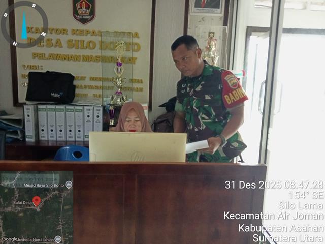 Kegiatan Puldata Ter berlangsung dengan lancar dan penuh kebersamaan. Perangkat desa menyambut baik kegiatan ini dan mendukung upaya Babinsa dalam memperkuat sinergi antara TNI dan pemerintah desa, dalam kesempatan tersebut seperti yang dilakukan oleh Personel Bintara Pembina Desa (Babinsa) Koramil 07/Air Joman jajaran Kodim 0208/Asahan Sertu Wagito turun kewilayah binaan untuk melaksanakan kegiatan Pul Data Ter bersama Perangkat Desa Ibu Suaibah (Kasi Pelayanan), kegiatan tersebut yang dilaksanakan bertempat di Kantor Desa Silo Bonto Kecamatan Silau Laut Kabupaten Asahan, Rabu (31/12/2025).