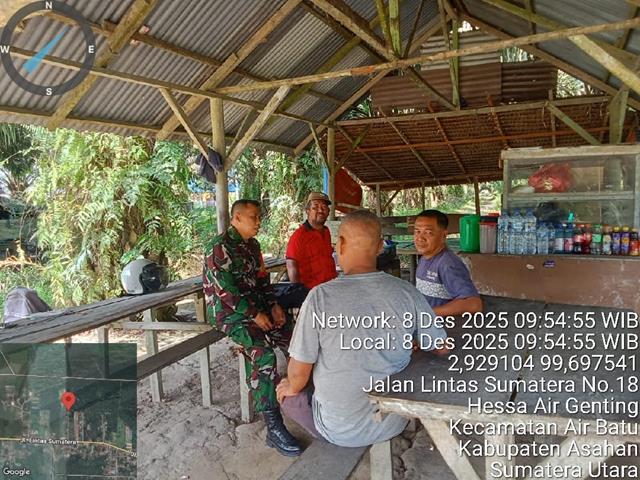 Asahan | Dalam rangka untuk memelihara dan menjalin hubungan baik dengan masyarakat, untuk meningkatkan sinergitas antara TNI dan masrakat, keakraban kepada warga binaan merupakan tugas pokok Babinsa. Salah satunya yaitu dengan melakukan komunikasi sosial dalam menciptakan interaksi serta kekompakan antara Babinsa dan warga binaannya. Inilah yang dilakukan oleh para Babinsa diwilayah binaan, dalam kesempatan ini seperti yang dilakukan oleh Personel Bintara Pembina Desa (Babinsa) Koramil 12/Air Batu jajaran Kodim 0208/Asahan Sertu Firman Samosir turun kewilayah binaan untuk melaksanakan kegiatan Komunikasi Sosial (Komsos) bersama dengan warga masyarakat Desa binaan, kegiatan Komunikasi Sosial dengan Warga Desa Binaan membahas tentang Situasi Kamtibmas saat ini, bersama dengan Bapak Buyung Lubis, Bapak Syahrul Siregar dan Bapak Umar Manurung, kegiatan tersebut yang dilaksanakan bertempat di Dusun III Desa Hessa Air Genting Kecamatan Air Batu Kabupaten Asahan, Senin (08/12/2025).