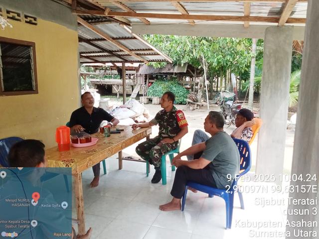 Komunikasi Sosial dengan Masyarakat Warga Desa Binaan, kegiatan bertujuan untuk menciptakan komunikasi dua arah yang baik antara Babinsa dan Warga Desa Binaan untuk mengetahui situasi yang berkembang terutama situasi Kamtibmas diseputaran Desa binaan, dalam kesempatan kali ini seperti yang dilakukan oleh Personel Bintara Pembina Desa (Babinsa) Koramil 12/Air Batu jajaran Kodim 0208/Asahan Serma Rahmad turun kewilayah binaan untuk melaksanakan kegiatan Komunikasi Sosial (Komsos) bersama dengan warga masyarakat Desa binaan, kegiatan Komunikasi Sosial dengan warga masyarakat binaan Kepala Desa Sijabut Teratai Bapak Darnono, Ketua BPD Bapak Bahroni, Kasus III Bapak Amat Zainuddin dan Ketua BPD Bapak Bahroni, kegiatan tersebut yang dilaksanakan bertempat di Dusun III Desa Sijabut Teratai Kecamatan Air Batu Kabupaten Asahan, Senin (09/02/2026).