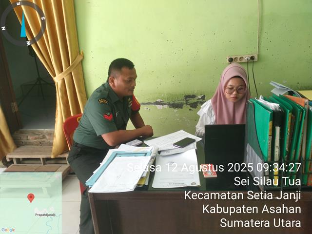 Dalam rangka untuk mensukseskan tugas-tugas pemerintah yang ada diwilayah binaan serta meperbaharui data kewilayahan, dalam kesempatan ini seperti yang dilakukan oleh Personel Bintara Pembina Desa (Babinsa) Koramil 13/Buntu Pane jajaran Kodim 0208/Asahan Koptu Riki Ramadhan turun kewilayah desa binaan untuk melaksanakan kegiatan Pul Data Ter bersama Aparatur Pemerintahan, kegiatan mendata Jumlah penduduk di Kantor Desa, melaksanakan Full Data Ter di Kantor Desa Bersama Aparatur Pemerintahan mendata rumah warga yang tidak layak huni serta mengetahui data jumlah penduduk disetiap Dusun bertujuan pemutakhiran data Demo dan Konsos terbaru meningkatkan hubungan kerja sama antara Babinsa dan Aparatur Pemerintahan guna menunjang tugas Pokok Babinsa, bersama dengan KasiPem Ibu Eka, kegiatan tersebut yang dilaksanakan bertempat di Kantor Desa Sei Silau Tua Kecamatan Setia Janji Kabupaten Asahan, Selasa (12/08/2025).