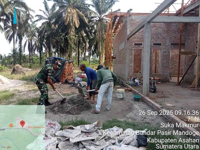 Asahan | Dalam rangka untuk memelihara dan menjalin hubungan baik Antara Babinsa dengn masyarakat, untuk meningkatkan rasa kepedulian terhadap masyarakat pada umumnya, guna meningkatkan kesejahteraan dan membangun keharmonisan dengan warga binaan, dalam kesempatan yang baik ini seperti halnya yang dilakukan oleh Personel Bintara Pembina Desa (Babinsa) Koramil 14/Bandar Pasir Mandoge jajaran Kodim 0208/Asahan Sertu Joni Tanjung turun kewilayah binaan untuk melaksanakan kegiatan membantu pembangunan rumah warga desa yang kurang mampu, ini merupakan salah satu bentuk untuk menjalin kedekatan dan kebersamaan TNI dengan warga, kegiatan Komsos dengan kepala tukang untuk merenovasi dapur rumah seorang warga, gotong royong membantu masyarakat membangun rumah warga, kegiatan ini bertujuan agar terjalin hubungan kerjasama yang baik antara Babinsa dengan warga binaan sehingga TNI semakin dicintai Rakyat, bersama dengan Bapak Gani dan Bapak Suherman, kegiatan tersebut yang dilaksanakan bertempat di Dusun XI Desa Suka Makmur Kecamatan Bandar Pasir Mandoge Kabupaten Asahan, Jumat (26/09/2025).