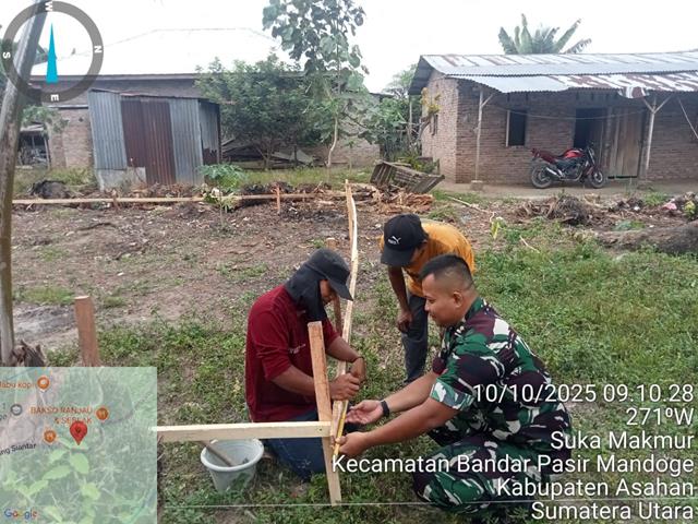 Asahan | Dalam rangka untuk memelihara dan menjalin hubungan baik Antara Babinsa dengn masyarakat, untuk meningkatkan rasa kepedulian terhadap masyarakat pada umumnya, guna meningkatkan kesejahteraan dan membangun keharmonisan dengan warga binaan, dalam kesempatan yang baik ini seperti halnya yang dilakukan oleh Personel Bintara Pembina Desa (Babinsa) Koramil 14/Bandar Pasir Mandoge jajaran Kodim 0208/Asahan Kopda Suyanto turun kewilayah binaan untuk melaksanakan kegiatan membantu pembangunan rumah warga desa yang kurang mampu, ini merupakan salah satu bentuk untuk menjalin kedekatan dan kebersamaan TNI dengan warga, kegiatan gotong royong untuk membantu membangun Rumah Warga. Kegiatan tersebut bertujuan untuk menjalin kerjasama yang baik antara warga dan babinsa sehingga TNI selalu dihati Rakyat,dan dapat menunjang tugas-tugas Pokok TNI kedepannya dalam penerapan 8 wajib TNI, bersama dengan Bapak Dika Panjaitan, Bapak Rohim, Bapak Adi Butar-butar dan Bapak Edi Sitorus, kegiatan tersebut yang dilaksanakan bertempat di Dusun V Desa Suka Makmur Kecamatan Bandar Pasir Mandoge Kabupaten Asahan, Jumat (10/10/2025).