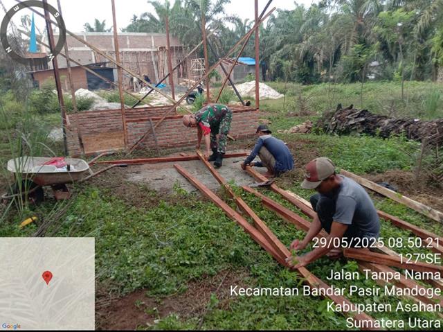 Asahan  |  Dalam rangka guna meningkatkan kesejahteraan dan membangun keharmonisan dengan warga binaan, dalam kesempatan yang baik ini seperti halnya yang dilakukan oleh Personel Bintara Pembina Desa (Babinsa) Koramil 14/Bandar Pasir Mandoge jajaran Kodim 0208/Asahan Serma Roy R Nababan turun kewilayah binaan untuk melaksanakan kegiatan membantu pembangunan rumah warga desa yang kurang mampu, ini merupakan salah satu bentuk untuk menjalin kedekatan dan kebersamaan TNI dengan warga, disamping itu juga untuk mengingatkan kembali tentang pentingnya bergotong royong, kegiatan gotong royong membangun pemukiman warga kegiatan tersebut dilaksanakan untuk membina hubungan yang baik antar Babinsa dengan warga sekaligus membantu mengatasi kesulitan Rakyat, bersama dengan Bapak S Simanjuntak dan Bapak Abdul Qodir, kegiatan tersebut yang dilaksanakan bertempat di Dusun 2 Desa Bandar Pasir Mandoge Kecamatan Bandar Pasir Mandoge Kabupaten Asahan, Jumat (30/05/2025).