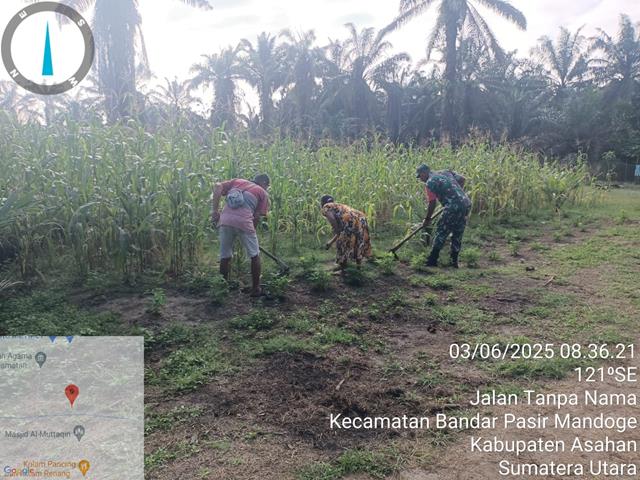 Wujud nyata kemanunggalan TNI dengan rakyat dalam meningkatkan ketahanan pangan wilayah, dalam kesempatan ini Personel Bintara Pembina Desa (Babinsa) Koramil 14/Bandar Pasir Mandoge jajaran Kodim 0208/Asahan Sertu Sudarman turun kewilayah desa binaan untuk melaksanakan kegiatan Komunikasi Sosial (Komsos) bersama dengan warga masyarakat, bersama masyarakat untuk melaksanakan pendampingan Ketahanan Pangan (Hanpang) jenis tanaman jagung dalam merawat dan membersihkan tanaman supaya menghasilkan produksi yang lebih baik dan menguntungkan. Kegiatan ini merupakan kedekatan antara Babinsa dengan warga binaan sehingga tercipta hubungan kerjasama yang baik mendukung tugas pokok TNI agar semakin di cintai rakyat, bersama dengan Bapak Charles Manurung dan Ibu Ruspita Br Sinaga, kegiatan tersebut yang dilaksanakan bertempat di Dusun II Desa Bandar Pasir Mandoge Kecamatan Bandar Pasir Mandoge Kabupaten Asahan, Rabu (04/06/2025).