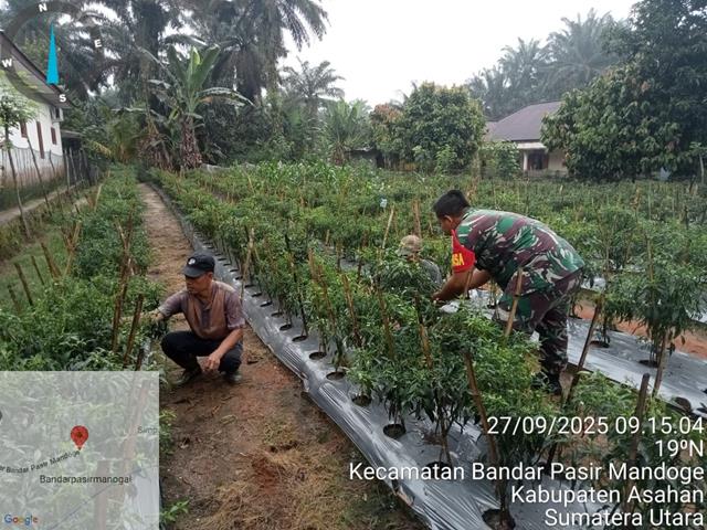 Dalam kesempatan ini seperti yang dilakukan oleh Personel Bintara Pembina Desa (Babinsa) Koramil 14/Bandar Pasir Mandoge jajaran Kodim 0208/Asahan Kopda Suyanto turun kewilayah binaan untuk melaksanakan kegiatan Komunikasi Sosial (Komsos) bersama dengan warga masyarakat binaan di areal pertanian warga yang sedang menanam cabai memberi semangat dan motivasi dengan masyarakat dengan laksanakan kegiatan pendampingan dalam perawatan tanaman cabe, bersama masyarakat melaksanakan pendampingan ketahanan pangan (Hanpang) jenis tanaman Cabai Hijau untuk membantu masyarakat memanen hasil kebun yang akan di jual ke pekan.tujuan  supaya tercipta kerjasama yang baik antara Babinsa dengan masyarakat dan mendukung tugas pokok TNI. Bersama Rakyat TNI kuat dan Babinsa selalu dihati Rakyat, bersama dengan Bapak Sopian dan Bapak Ari Sitompul, kegiatan tersebut yang dilaksanakan bertempat di Dusun VI Desa Bandar Pasir Mandoge Kecamatan Bandar Pasir Mandore Kabupaten Asahan, Sabtu (27/09/2025).