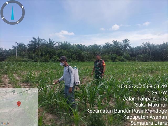 Dalam hal ini seperti yang dilakukan oleh Personel Bintara Pembina Desa (Babinsa) Koramil 14/Bandar Pasir Mandoge jajaran Kodim 0208/Asahan Serda Suheriyono turun kewilayah desa binaan untuk melaksanakan kegiatan penyemprotan hama pada tanaman jagung dalam rangka kegiatan Hanpang diwilayah binaan, bersama masyarakat melaksanakan pendampingan ketahanan pangan (Hanpang) jenis tanaman Jagung (Pioneer) untuk membantu masyarakat melaksanakan Penyemprotan Hama pada Tanaman Jagung. Kegiatan ini rutin dilakukan para petani agar hama yang mengganggu tanaman jagung mati sehingga tanaman jagung dapat tumbuh dan berkembang dengan baik sehingga hasil panen yang diharapkan para petani sesuai dengan target, kegiatan ini juga bertujuan agar terjalinnya hubungan yang baik antara Babinsa dengan Warga binaan sehingga TNI semakin di cintai Rakyat, bersama dengan Bapaķ R Sirait (pemilik lahan jagung), kegiatan terseut yang dilaksanakan bertempat di Dusun VIII Desa Suka Makmur Kecamatan Bandar Pasir Mandoge Kabupaten Asahan, Rabu (11/06/2025).
