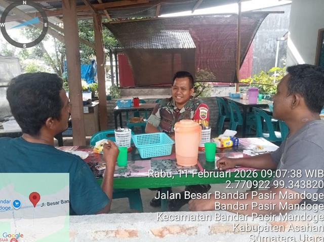 Asahan | Dalam rangka untuk menjalin silaturahmi yang baik dengan warga desa binaan serta menjaga keamanan diwilayah, dalam kesempatan ini seperti yang dilakukan oleh Personel Bintara Pembina Desa (Babinsa) Koramil 14/Bandar Pasir Mandoge jajaran Kodim 0208/Asahan Kopda Suyanto turun kewilayah binaan untuk melaksanakan kegiatan Komunikasi Sosial (Komsos) bersama dengan warga Masyarakat binaan dalam rangka membahas tentang keamanan lingkungan desa dengan menggalakan kembali Pos Kamling, dengan melaksanakan Komsos membahas tentang Pos Kamling agar tetap aktif supaya terjaga keamanan dan ketertiban sekaligus menjaga kebersihan lingkungani Desa, kegiatan dilaksanakan guna membangun kebersamaan di dusun sehingga tetap kondusif, bersama dengan Bapak Supri dan Bapak Irul Sitompul, kegiatan tersebut yang dilaksanakan bertempat di Dusun II Desa Bandar Pasir Mandoge Kecamatan Bandar Pasir Mandoge Kabupaten Asahan, Rabu (11/02/2026).