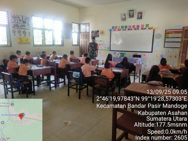 Guna penyiapan Siswa-siswi untuk memberikan Pengetahuan Wawasan Kebangsaan tentang memupuk rasa cinta tanah air dan menjalankan kedisiplinan di sekolah, dalam kesempatan ini seperti halnya yang dilakukan oleh Personel Bintara Pembina Desa (Babinsa) Koramil 14/Bandar Pasir Mandoge jajaran Kodim 0208/Asahan Serka L Siringo Ringo turun kewilayah binaan untuk melaksanakan kegiatan Wasbang dengan memberi materi kebangsaan kepada para Siswa-siswi SD N 014733 melaksanakan kegiatan Wawasan Kebangsaan yaitu Cinta Tanah Air supaya sejak dini dididik untuk menuju Indonesia Emas Tahun 2045 dengan membentuk karakter, disiplin dan tanggung jawab dalam diri individu. Kegiatan ini juga bertujuan untuk menunjang tugas pokok TNI, bersama dengan Kepala Sekolah SD N 014733 beserta Guru dan Murid Siswa/i SD N 014733, bertempat di Ruang Kelas VI SDN 014733 Dusun IX Bandar Pasir Mandoge Kec. Bandar Pasir Mandoge Kab Asahan, Sabtu (13/09/2025).