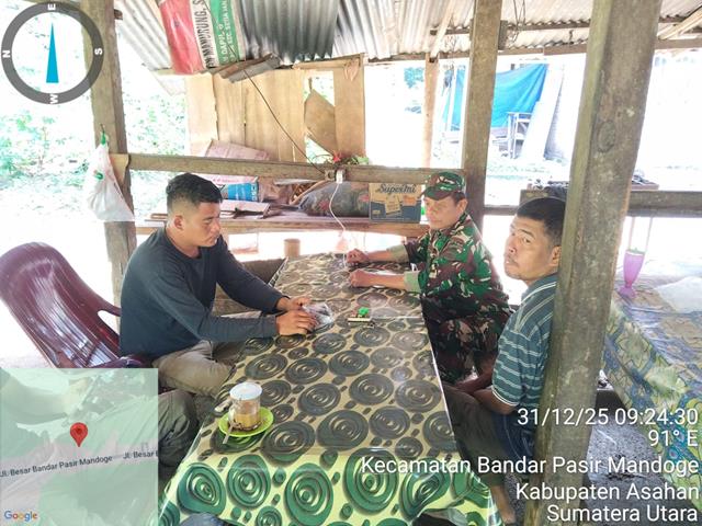 Komunikasi Sosial dengan Masyarakat Warga Desa Binaan, kegiatan bertujuan untuk menciptakan komunikasi dua arah yang baik antara Babinsa dan Warga Desa Binaan untuk mengetahui situasi yang berkembang terutama situasi Kamtibmas diseputaran Desa binaan, dalam kesempatan kali ini seperti yang dilakukan oleh Personel Bintara Pembina Desa (Babinsa) Koramil 14/Bandar Pasir Mandoge jajaran Kodim 0208/Asahan Peltu D Siburian turun kewilayah binaan untuk melaksanakan kegiatan Komunikasi Sosial (Komsos) bersama dengan warga masyarakat Desa binaan, Komsos dengan Warga Masyarakat Binaan menghimbau dimusim hujan menjaga Kebersihan lingkungan guna mengantisipasi Banjir dan membiasakan hidup bersih agar tetap sehat, Komsos bersama Masyarakat tentang keamanan dan kebersihan lingkungan guna mempererat hubungan Silahturahmi yang baik dan humanis sekaligus kebersamaan antara Babinsa dengan masyarakat untuk mendukung tugas pokok TNI agar semakin dicintai masyarakat, bersama dengan Bapak Sanuel, Bapak Madon dan Bapak Nain, kegiatan tersebut yang dilaksanakan bertempat di Dusun III Desa Bandar Pasir Mandoge Kecamatan Bandar Pasir Mandoge Kabupaten Asahan, Rabu (31/12/2025).