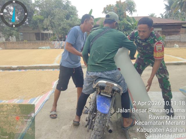 Asahan  |  Selain membantu secara langsung, para Babinsa juga memberikan edukasi kepada para petani untuk meningkatkan produktivitas dan kualitas hasil panen mereka, kami berharap pendampingan seperti ini dapat memberikan dampak positif kepada petani dalam menjaga kualitas panen mereka, dalam kesempatan ini seperti yang dilakukan oleh Personel Bintara Pembina Desa (Babinsa) Koramil 18/Meranti jajaran Kodim 0208/Asahan Koptu Julianto turun kewilayah binaan untuk menunjukkan dedikasinya dalam mendukung masyarakat desa binaannya dan melaksanakan kegiatan ketahanan pangan membantu menjemur gabah padi yang masih basah, dengan melaksanakan kegiatan wanwil membantu menjemur padi bersama warga, bersama dengan Bapak Andi (warga) dan Bapak Sofyan (warga), kegiatan tersebut yang dilaksanakan bertempat di Dusun XI Desa Rawang Lama Kecamatan Rawang Panca Arga Kabupaten Asahan, Kamis (02/04/2026).