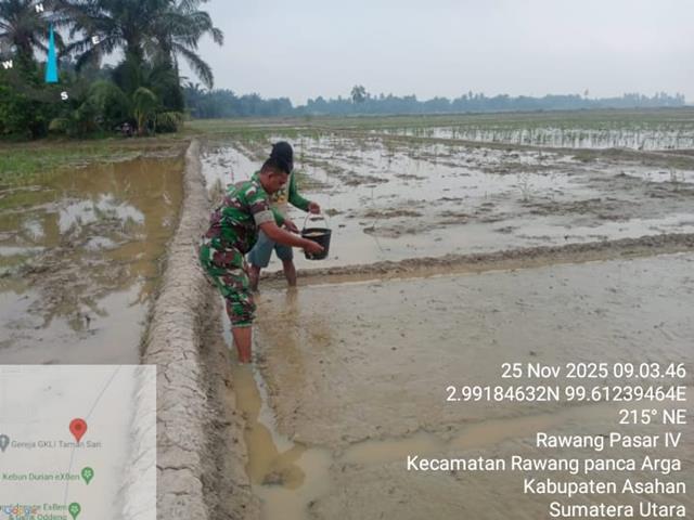 Asahan | Dalam rangka bercocok tanam padi, benih padi yang bagus dan unggul akan lebih tahan terhadap hama dan penyakit, selain itu pertumbuhannya juga bagus, waktu panen yang lebih singkat serta hasil panen yang optimal, dalam kesempatan ini Personel Bintara Pembina Desa (Babinsa) Koramil 18/Meranti jajaran Kodim 0208/Asahan Kopda Dedi Susanto turun kewilayah binaan untuk melaksanakan kegiatan ketahanan Pangan membantu warga binaan dalam rangka untuk melaksanakan pembibitan padi untuk ditanam di sawah, pendampingan kepada petani ini adapun maksud dan tujuan membantu petani menyemai beni padi untuk persiapan tanam padi bulan depan serta mendukung program ketahanan pangan nasional dan juga memberi semangat dan memberi motivasi kepada petani agar lebih maju dan mendapatkan hasil yang bagus, kegiatan tersebut yang dilaksanakan bertempat di Dusun Vl Desa Rawang Pasar IV Kecamatan Rawang Panca Arga Kabupaten Asahan, Selasa (25/11/2025).