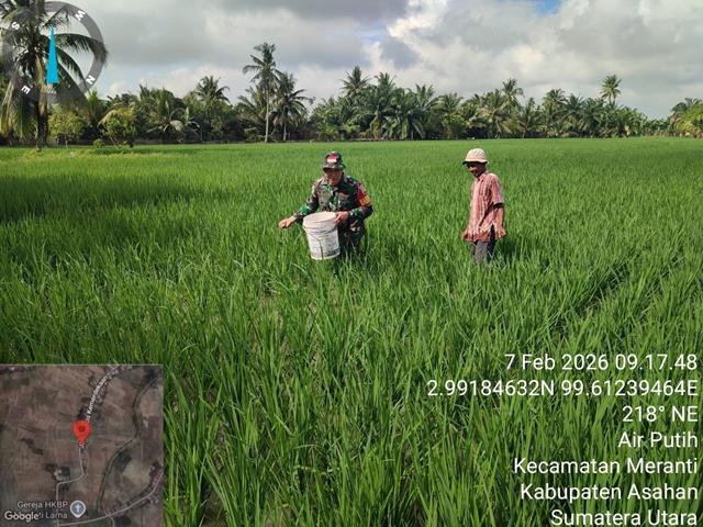 Dalam kesempatan ini seperti yang dilakukan oleh Personel Bintara Pembina Desa (Babinsa) Koramil 18/Meranti jajaran Kodim 0208/Asahan Kopda Rahmat Saleh turun kewilayah binaan untuk melaksanakan kegiatan ketahanan pangan, kegiatan pendampingan hanpang membantu petani memupuk tanaman padi, kegiatan Hanpangan membantu petani memupuk padi secara manual, dengan melaksanakan kegiatan membantu petani memupuk tanaman padi di sawah pada usia 45 hari setelah tanam (HST), kegiatan ini di laksanakan adalah bentuk dari untuk meningkatkan ketahanan pangan padi di wilayah binaan, bersama dengan Bapak Robert Sitorus.