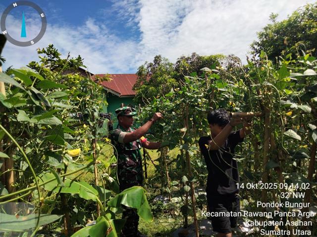 Dalam kesempatan ini seperti yang dilakukan oleh Personel BIntara Pembina Desa (Babinsa) Koramil 18/Meranti jajaran Kodim 0208/Asahan Serda Eko Hardika turun kewilayah binaan untuk melaksanakan kegiatan membantu warga Membersihkan kebun kacang Panjang, kegiatan tersebut bertujuan untuk lebih mengenal antara Babinsa dengan Seluruh warga desa binaan, kegiatan membantu warga Memanen sayuran kacang panjang tersebut bertujuan untuk menciptakan hubungan yang humanis antara babinsa dengan warga binaan, Babinsa senantiasa menghimbau dan memberikan Motipasi kepada seluruh warga untuk dapat memanfaatkan lahan semaksimal mungkin dengan membudi daya tanaman pangan agar tetap tersedianya kebutuhan pangan dan menambah penghasilan masyarakat, bersama dengan Bapak Donal (pemilik kebun), kegiatan tersebut yang dilaksanakan bertempat di Desa Pondok Bungur Kecamatan Rawang Panca Arga Kabupaten Asahan, Selasa (14/10/2025).