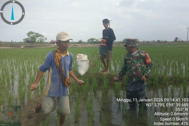 Dalam rangka untuk memelihara dan menjalin hubungan baik dengan masyarakat, untuk meningkatkan Sinergitas dan kemanunggalan antara TNI dengan masyarakat, dalam kesempatan ini seperti yang dilakukan oleh Personel Bintara Pembina Desa (Babinsa) Koramil 18/Meranti jajaran Kodim 0208/Asahan Serda Adong Rajaguguk turun kewilayah binaan untuk melaksanakan kegiatan ketahanan pangan, dengan melaksanakan pendampingan Han Pangan dilahan Sawah dengan membantu petani dalam Pemupukan, Pendampingan kepada petani warga Bapak G Sirait (warga Dusun V) dan Bapak Apriles Silitonga, kegiatan tersebut yang dilaksanakan bertempat di Dusun V Desa Rawang Pasar Vl Kecamatan Rawang Panca Arga Kabupaten Asahan, Minggu (11/01/2026).
