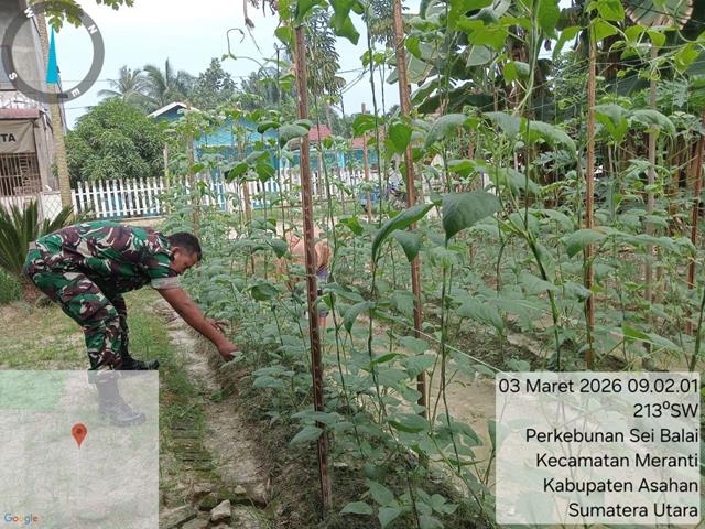 Asahan  |  Adapun kegiatan yang dilakukan hari ini adalah pembersihan dari gulma dan perawatan lahan kebun yang ditanami Kacang Panjang, Terong, Cabe rawit, Ubi kayu, Jagung, Pare, pepaya madu, dan Labu Jepang. Perawatan yang rutin dan pembersihan dari pengganggu gulma dapat mengoptimalkan dalam pertumbuhan tanaman agar tumbuh dengan baik, dalam kesempatan kali ini seperti yang dilakukan oleh Personel Bintara Pembina Desa (Babinsa) Koramil 18/Meranti jajaran Kodim 0208/Asahan Serma Henry Gunawan turun kewilayah binaan untuk melaksanakan kegiatan membantu warga membersihkan kebun sayuran  kacang Panjang bersama masyarakat melaksanakan pendampingan ketahanan pangan (Hanpang) jenis tanaman Kacang Panjang untuk selalu merawat dan membersihkan tanaman agar menghasilkan buah lebih produktif dan menguntungkan, dengan melaksanakan giat Hanpangan bersama petani warga Ibu Ponisah (Warga Dusun V), kegiatan tersebut yang dilaksanakan bertempat di Dusun V Desa Perkebunan Sei Balai Kecamatan Meranti Kabupaten Asahan, Selasa (03/03/2026).